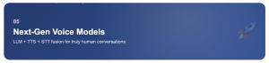 These next-gen voice models form a powerful stack that understands context, generates thoughtful replies, and delivers them with natural tone, empathy, and emotional nuance. LLMs serve as the conversational brain, enabling flexibility, memory, and fluid dialogue. TTS brings voice to life with realistic expression and regional character, while STT ensures accurate understanding even in noisy, real-world environments.